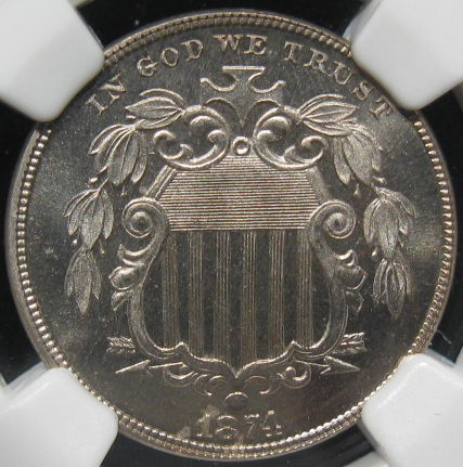 1866 Shield nickel with dual die breaks on the reverse. Probably weren't many more struck with this die before it was retired or completely fell apart. NGC AU55.