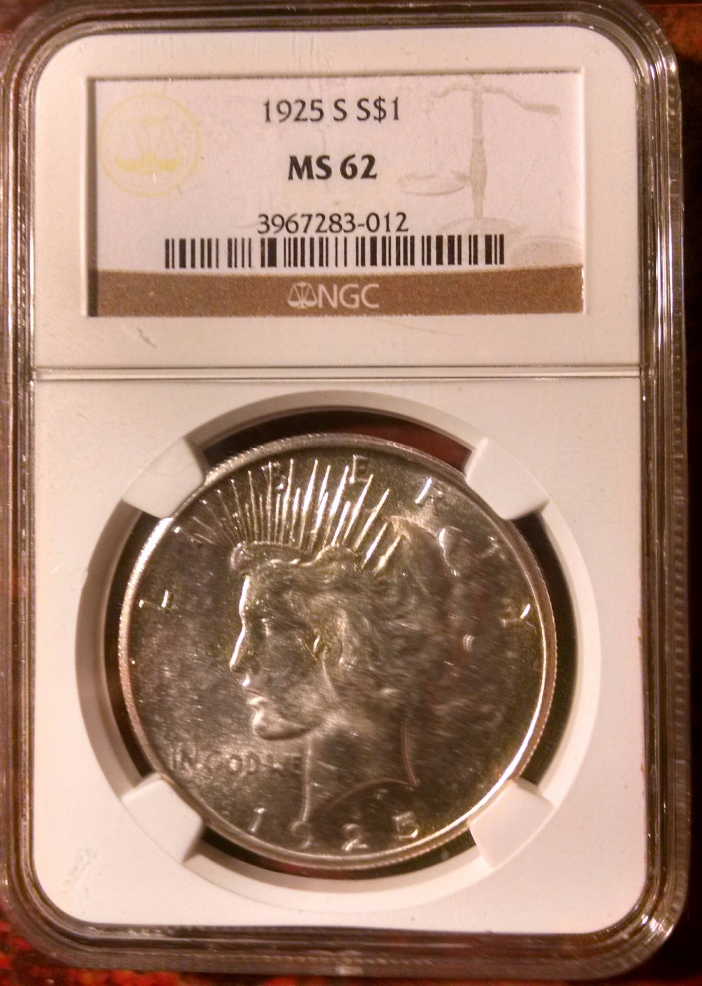 The bluish discoloration makes me suspect something is amiss, such as a botched cleaning attempt. Let me summon @Brett_in_Sacto for a Peace specialist's viewpoint.