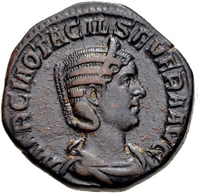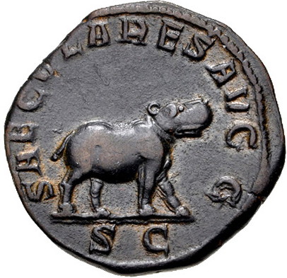 Otacilia Severa. Augusta, Æ Sestertius AD 244-249 Secular Games issue., 4th officina. 9th emission of Philip I, AD 248 Rome mint Diameter: 28 mm Weight: 15.99 grams Obverse: Draped bust right, wearing stephane Reverse: Hippopotamus standing right Reference: RIC IV 200a (Philip I); Banti 13 Other:12h … Good VF, dark brown patina, with some red. Ex Robert O. Ebert Collection CNG Coin Shop (Item #943717, purchased in 2013)