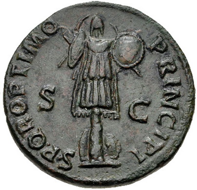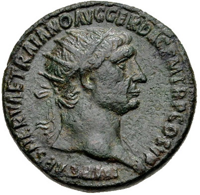 Trajan Æ Dupondius 98-117 AD Rome mint Struck circa AD 103-107 Diameter: 27 mm Weight: 13.39 grams Obverse: Radiate bust right, wearing aegis Reverse: Trophy with two shields at base Reference: RIC II 586; Woytek 196cA Other: 6h ... VF, green patina, numerous cleaning scratches on reverse Ex Robert O. Ebert Collection CNG Auction 298, Lot #146