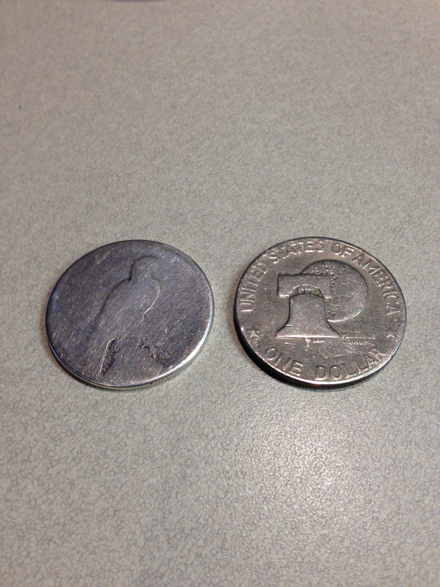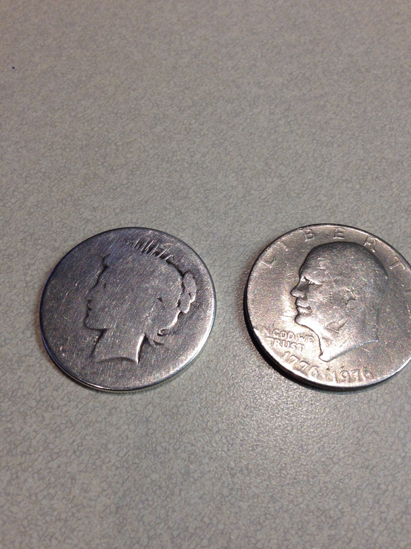 The Ike I found back in the mid-80's. It was very worn even then. I've kept it in my wallet for 30+ years as a good luck piece. I figure it had been a casino coin. It won me an apartment in a coin toss (heads side is heavier than tails!).
