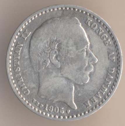# 1. Denmark. 25 ore 1905, silver .600, weight - 2,42, size - 17 mm, mintage - 1722000 pcs. Demonetized: September 30 2008. Ruler: king Christian IX (1863-1906).