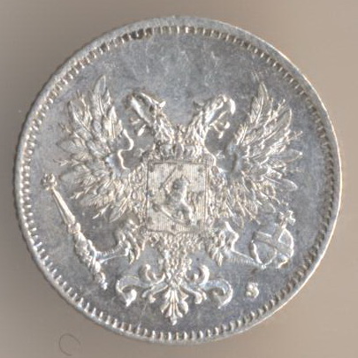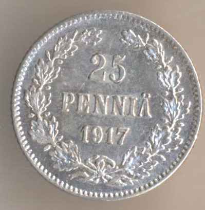 # 4. Grand principality of Finland. 25 pennia 1917, silver .750, weight - 1,2747 g, size - 16 mm, mintage - 2310000 pcs. Russian Provisional Government.