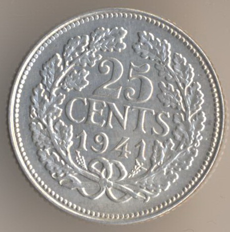 # 3. Netherlands. 25 cents 1941, silver .640, weight - 3,58 g., size - 19 mm, mintage - 40000000 pcs. Engraver: J.C. Wienecke. Ruler queen Wilhelmina (1890-1948).