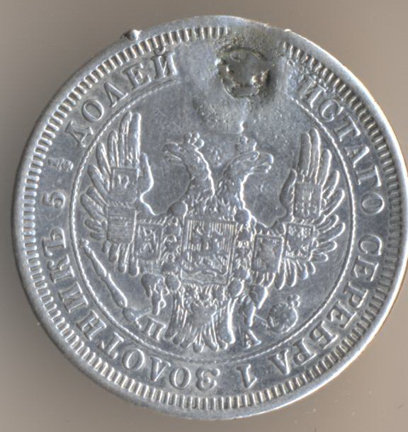 # 5. Russian Empire. 25 kopeks 1852, silver .868, weight - 5,183 g., mintage - 2160000 pcs. Ruler: emperor Nicolas I (1825-1855).