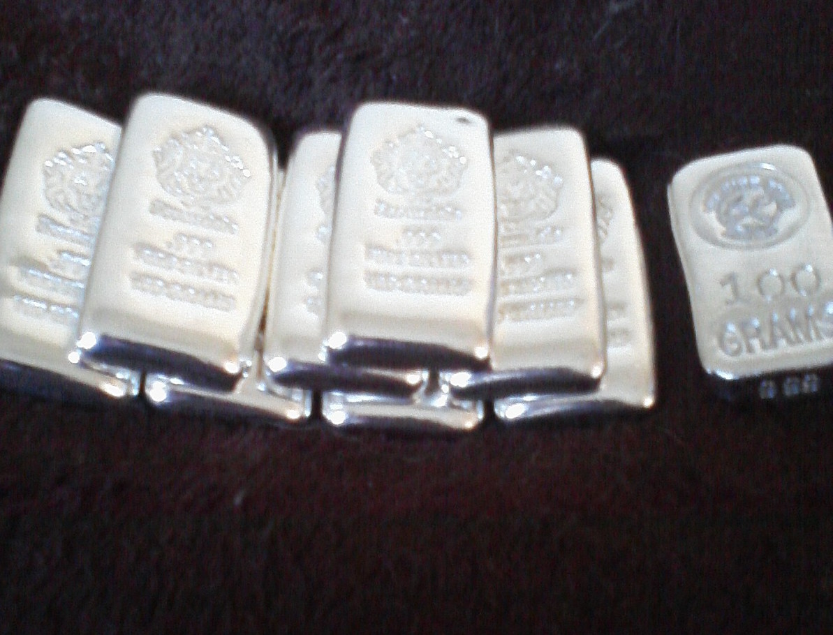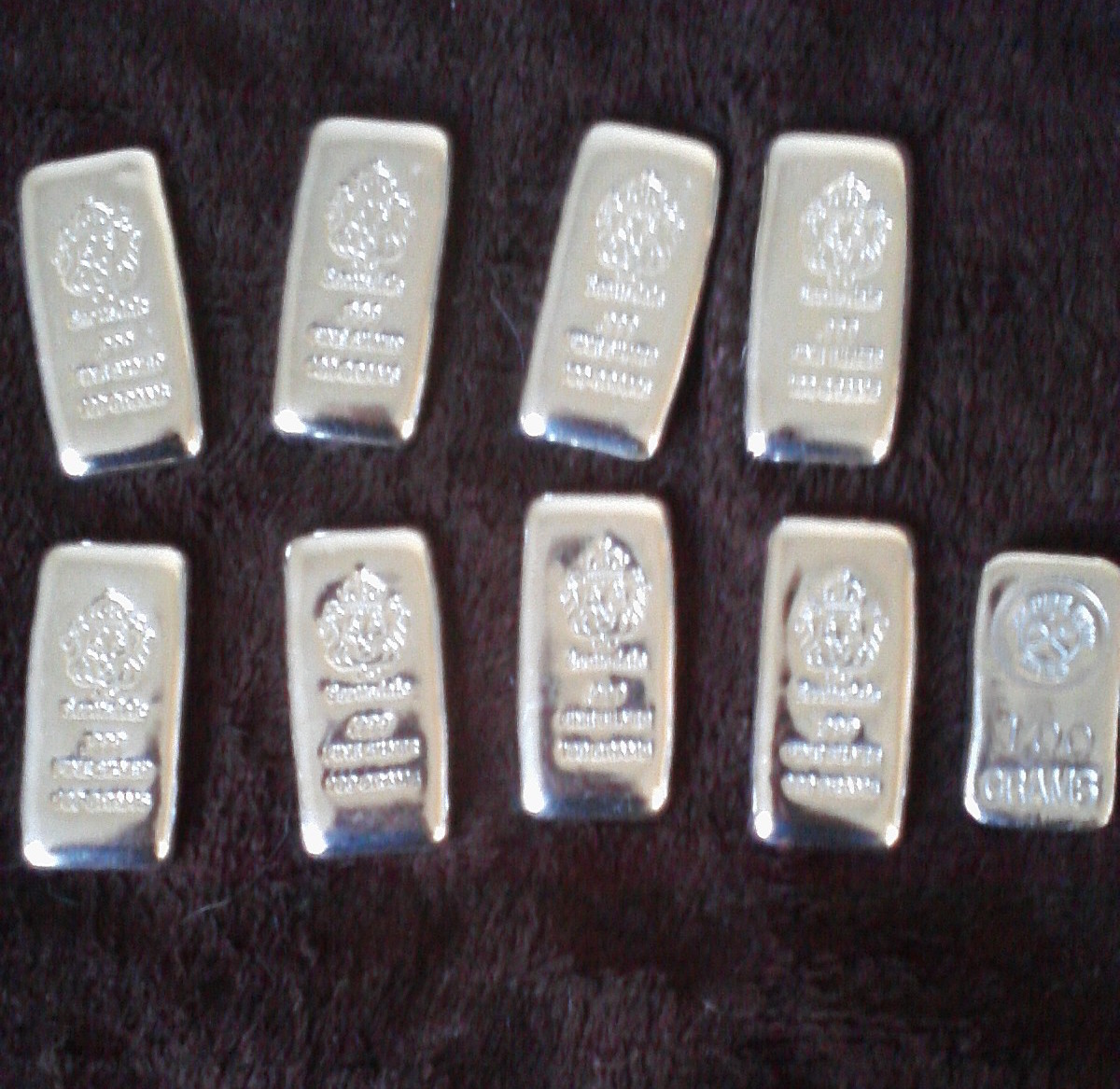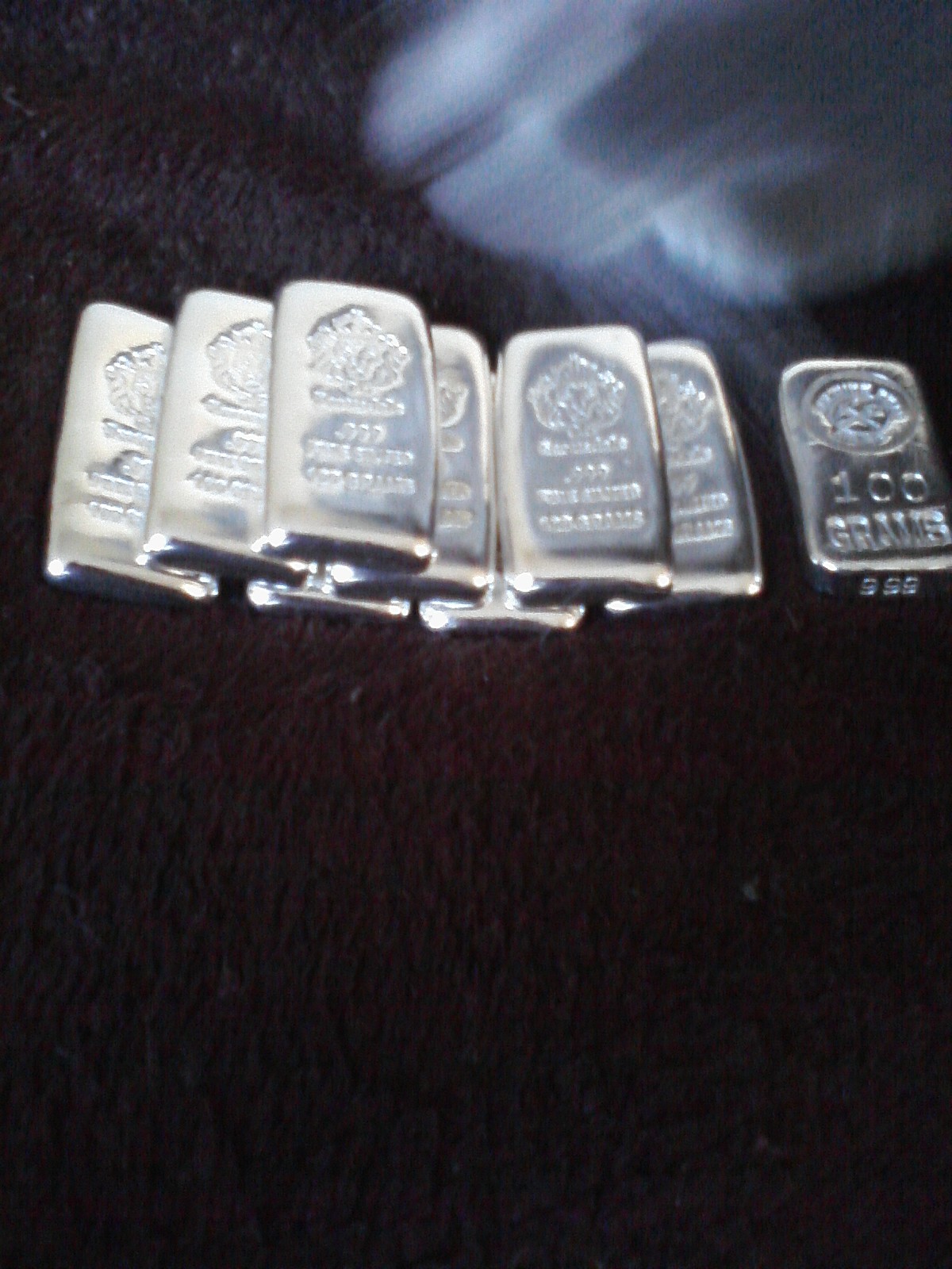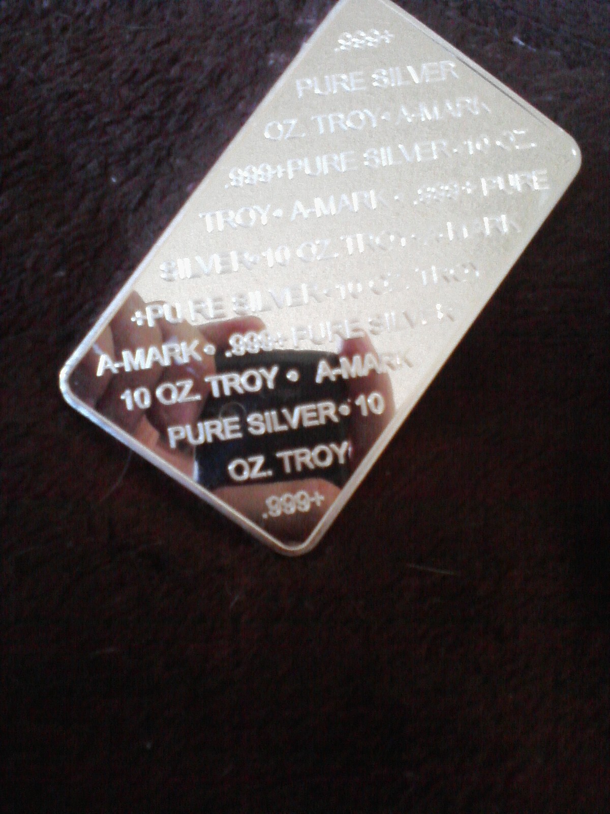 my new paper weight.... A-Mark 10 oz'er bar. Beautiful mirror reflections. my 8 Scottsdale 100 grams bars and 1 Vulture Peak Mines 100 gram bar. my little stack is growing again. sorry for the very crappy pics... affordable silver. I love it.