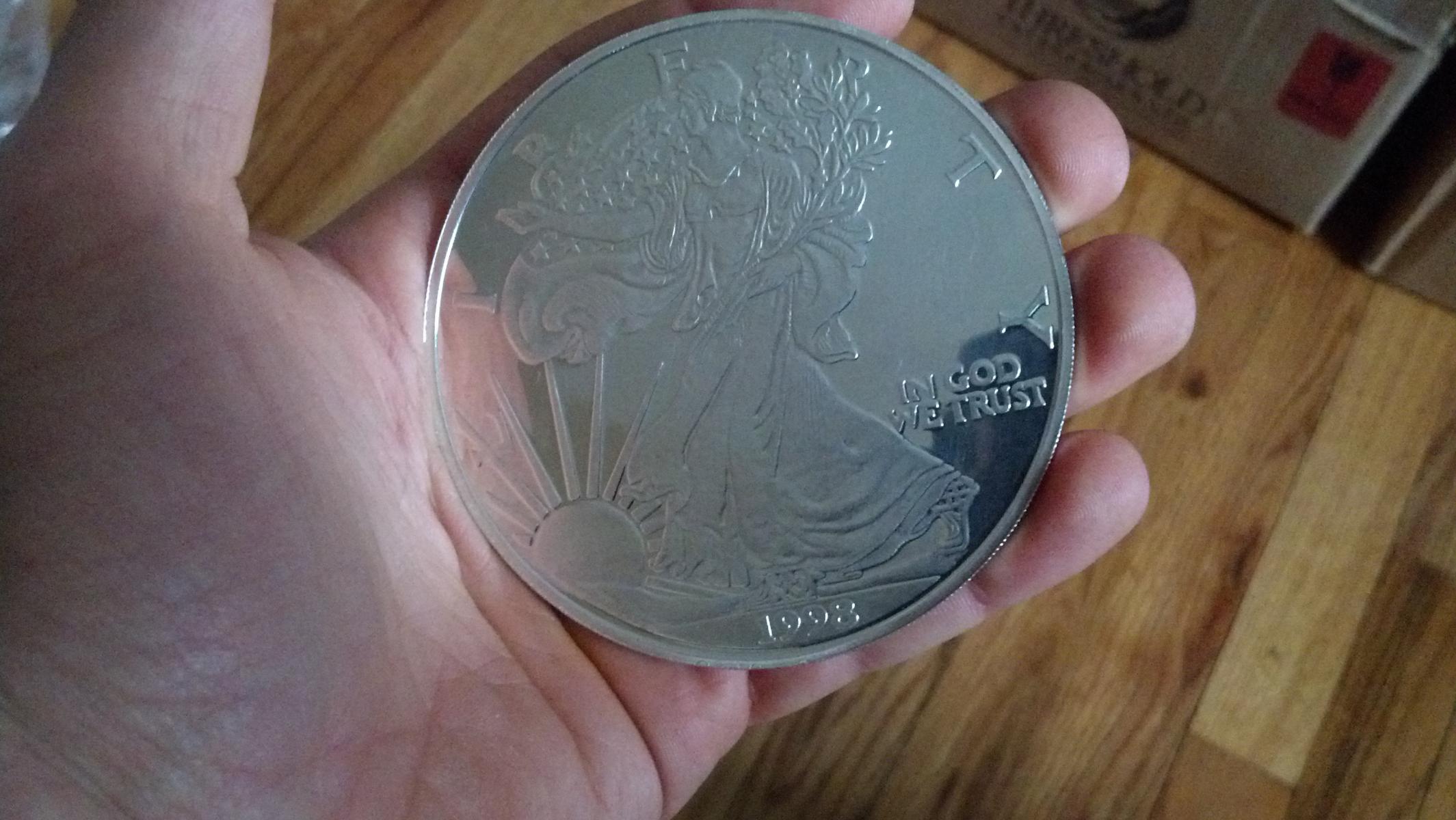 Not saying yours is, but there are some fake large Eagles out there. One telltale is confusing/incorrect weight designations. What is it's actual weight? Any edge marks/numbers? My largies have purity, weight and serial # on edge.