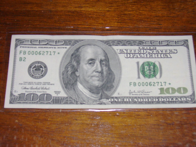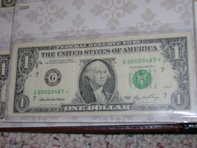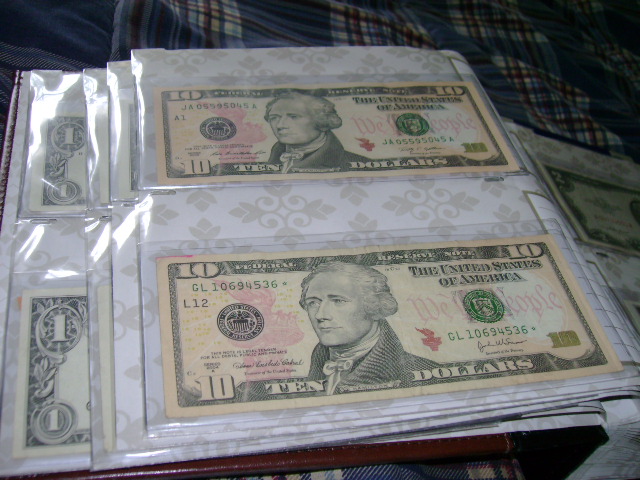i started collecting stars about 2 weeks ago at the bank. i only sit in a teller window when i'm covering someone's vacation, so i had a couple good weeks to check bills at the drive-up for the first half of october while the regular teller was off. i haven't bought every star i've seen because i can't afford to pull out all the $50 and $100 stars i come across, but i keep all the singles and everthing i can afford up through $20's right now. if i find one in better condition or with a lower serial, i trade one out, so my collection is pretty small right now. also, i had to use a $20* today to buy groceries, so i'm down to one at the moment. anyways... 2009 $20 JD 00136389 * (640k run) 2006 $5 IF 01936585 * 2009 $1 A 00410176 * 2006 $1 F 05417628 * 2009 $1 B 00787220 * 2006 $1 L 04437968 * 2003A $1 C 01737845 * 2003A $1 B 03354222 *