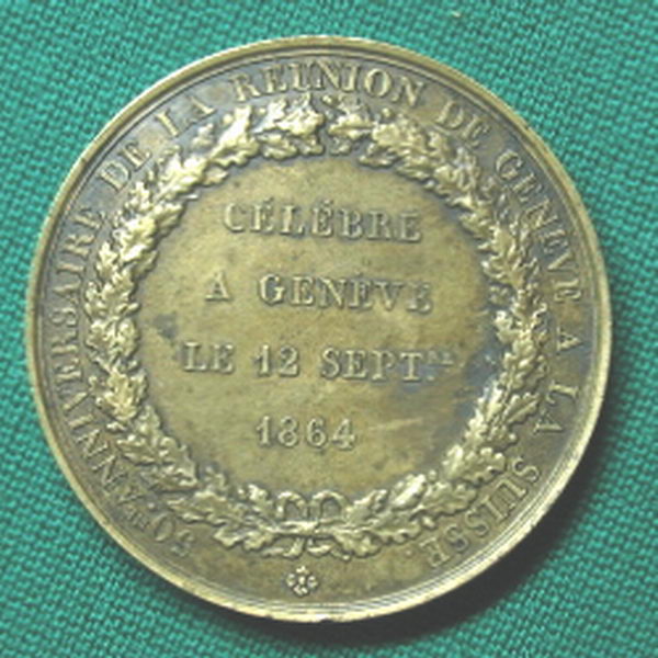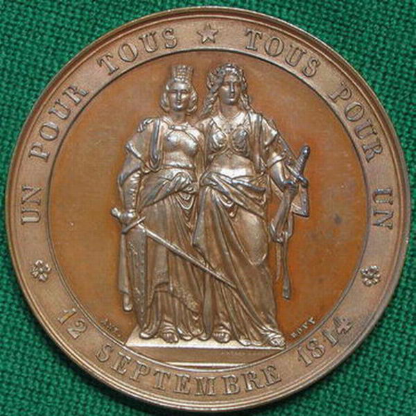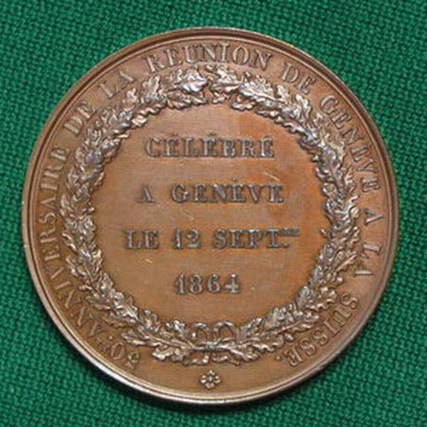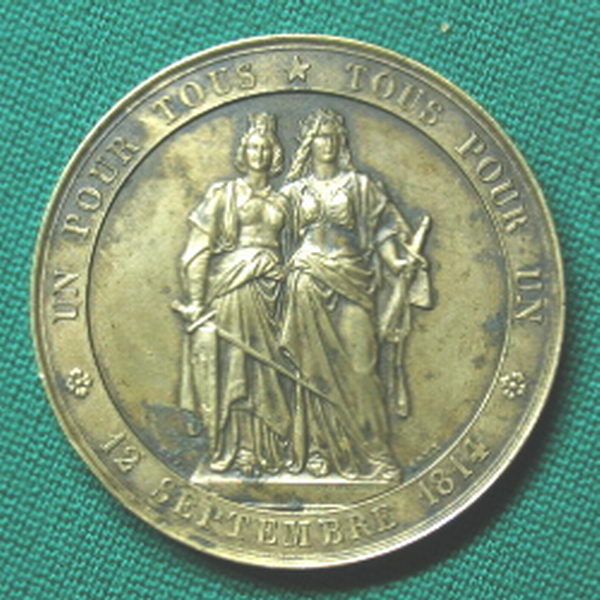 This medal was struck in copper (shown) and also brass or bronze (not sure which but it looks more like brass). I bought the copper one at the FUN Show in 2005. I didn't find the brass one until a few years later on eBay, and quite frankly, didn't even know one existed. Here is the story behind them........ The medals commemorate the 50th Anniversary of the return of the Geneva Canton to the Swiss Confederation in 1814. Prior to that, it had been under French rule for 3 centuries. If you look at a map, you will see that the Geneva Canton is surrounded almost completely by France with only a small spit of land connecting it to Switzerland. To this day, French is still a dominant language in the Geneva Canton. The high points of the copper specimen are a beautiful irridescent blue. This is what drew my attention to it at the FUN Show in the first place. I've seen other specimens of the copper a couple of times on eBay, but they have been in far worse condition. The brass specimen doesn't look anywhere near as nice, but since I had never seen any others before, it was a "must have" to accompany the copper. I paid $165 for the copper and $75 for the brass, but I wouldn't sell them for that since they are so hard to find. Thanks for the interest. Chris