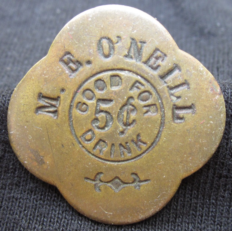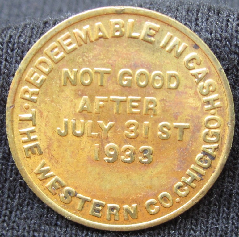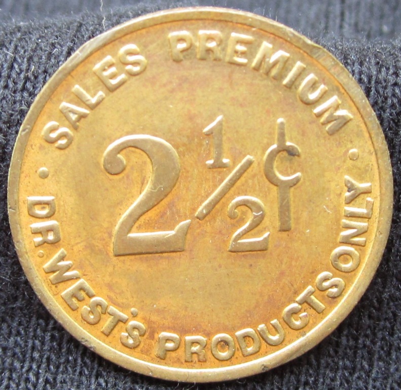 1933 Dr. West's Products Good For 2 1/2 cents, The Western Company M. E. O'Neill Good For 5 cent drink brockage of anvil coin reverse on unknown host planchet