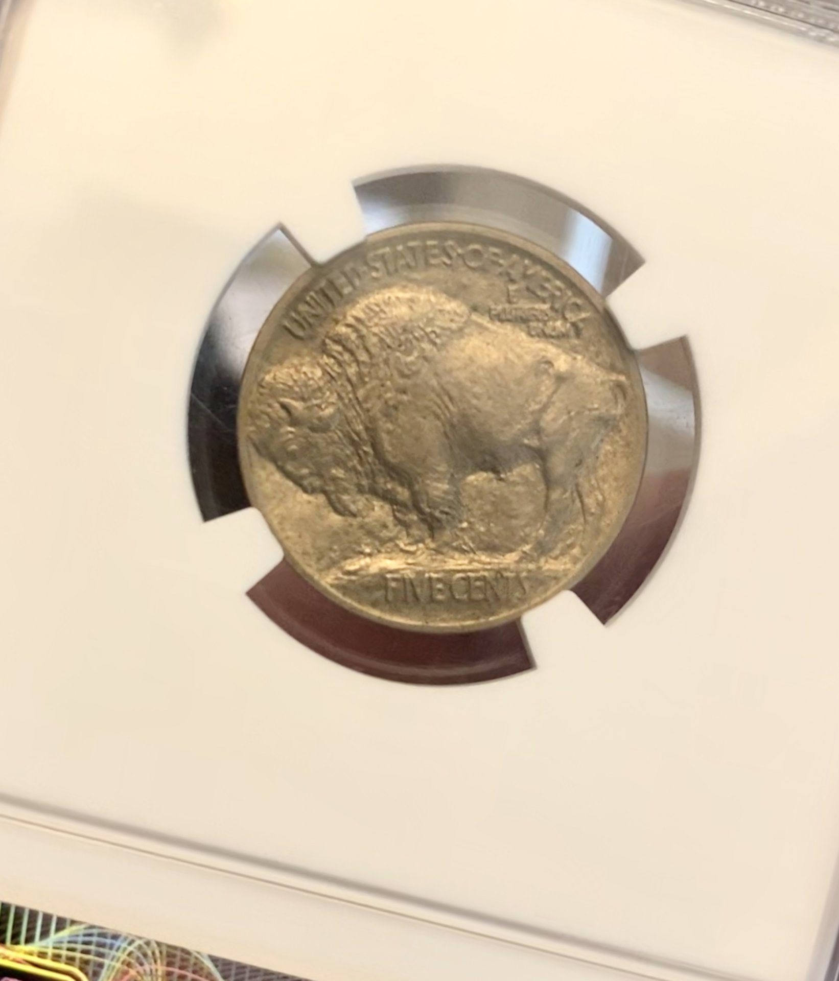 This is the Denver nickel from the same mint set. More hits visible and only 5FS. Looking at the price guides it appears that the D in higher grades is a bit rarer than the Philadelphia, as indicated by a slightly higher relative price.
