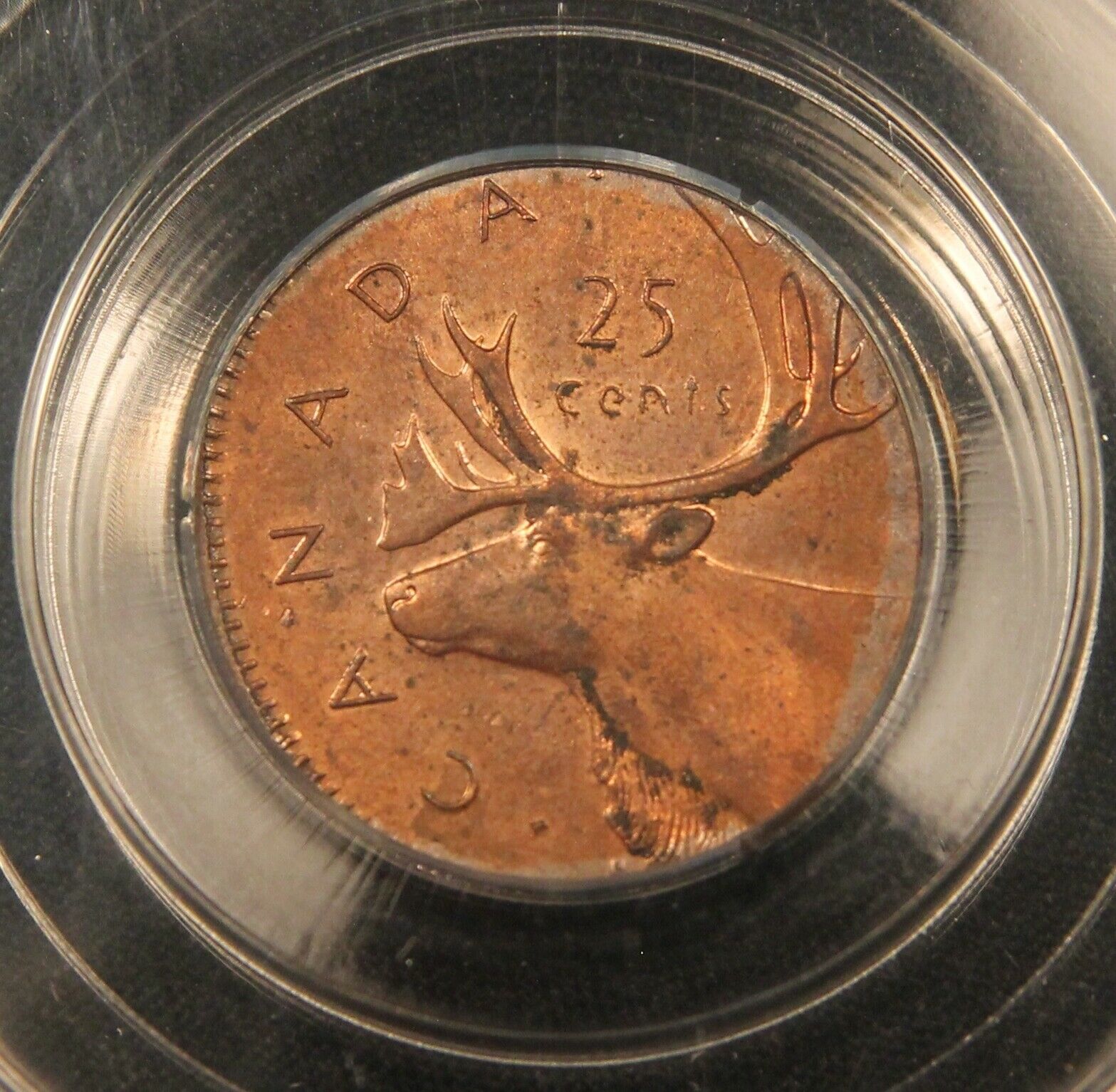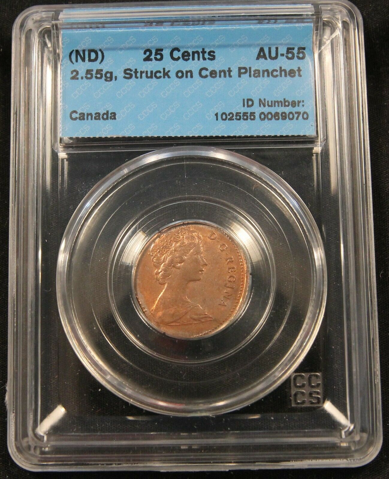 Patience is a virtue. I have waited for a reasonably priced quarter on cent planchet error for a while. I pounced on this 1 for $422.00 . There is nothing like getting a coin you've wanted for so long and finally buying it. So happy now. Canada Major off-metal ERROR 25 Cents struck on wrong 1 Cent planchet (ND) 1982-1989 is 2.5 grams 2.55g AU-55 grade .CCCS . sellers pics...