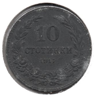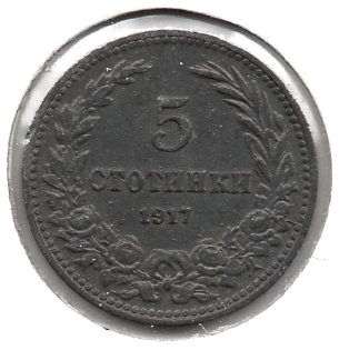 Bulgaria WWI "Bulgaria, which had the largest army in the Balkans, declared war on Serbia in October 1915. Britain, France and Italy responded by declaring war on Bulgaria. In alliance with Germany, Austria-Hungary and the Ottomans, Bulgaria won military victories against Serbia and Romania, occupying much of Macedonia (taking Skopje in October), advancing into Greek Macedonia, and taking Dobruja from Romania in September 1916. Thus Serbia was knocked out of the war, and Turkey was temporarily rescued from collapse. By 1917, Bulgaria fielded more than a quarter of its 4.5 million population in a 1,200,000-strong army, and inflicted heavy losses on Great Britain (Dorian), France (Monastir), the Russian Empire (Dobrich) and the Kingdom of Romania (Tutrakan). However, the war soon became unpopular with most Bulgarians, who suffered great economic hardship and also disliked fighting their fellow Orthodox Christians in alliance with the Muslim Ottomans. The Russian Revolution of February 1917 had a great effect in Bulgaria, spreading anti-war and anti-monarchist sentiment among the troops and in the cities. In June Radoslavov's government resigned. Mutinies broke out in the army, Stamboliyski was released and a republic was proclaimed." (Wikipedia) Bulgaria - 5 Stotinki - 1917 - KM #24a Bulgaria - 10 Stotinki - 1917 - KM #25a