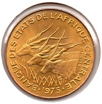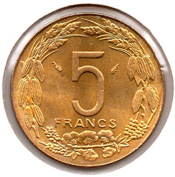 Central African States - 5 Francs - 1975 - Obv.jpg Central African States - 5 Francs - 1975 - Rev.jpg