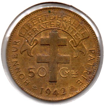 French Equatorial Africa - 50 Centimes - 1942 SA - Obv.jpg French Equatorial Africa - 50 Centimes - 1942 SA - Rev.jpg