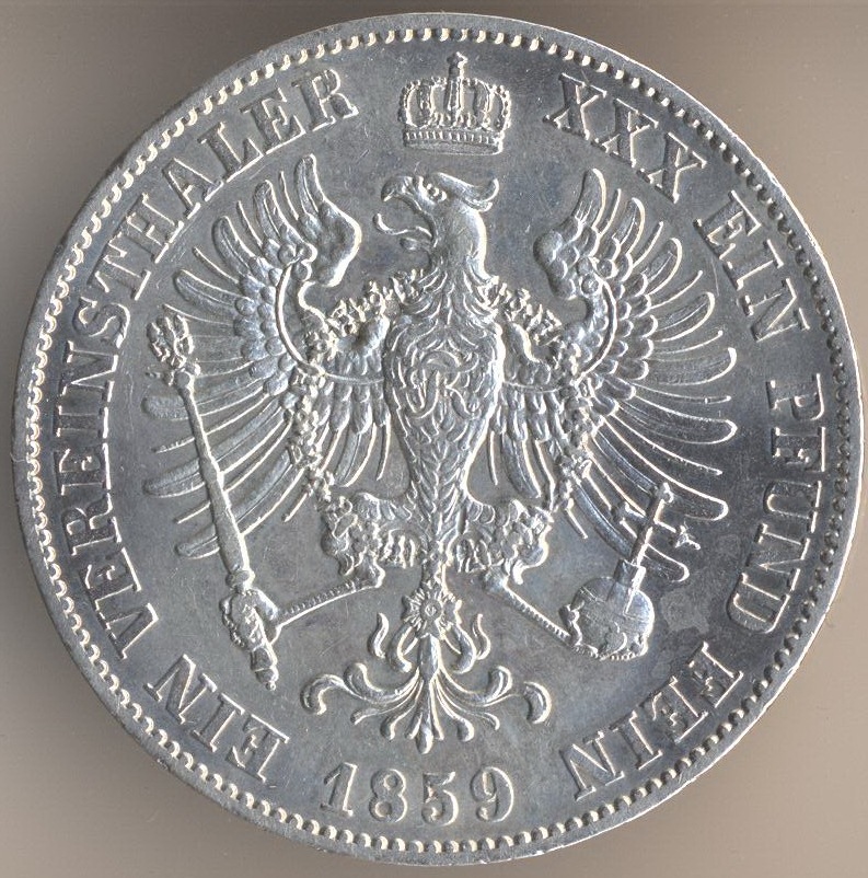 Thaler 1859, silver .900, weight - 18,52 g. Berlin Mint. Friedrich Wilhelm IV (1840-1861).