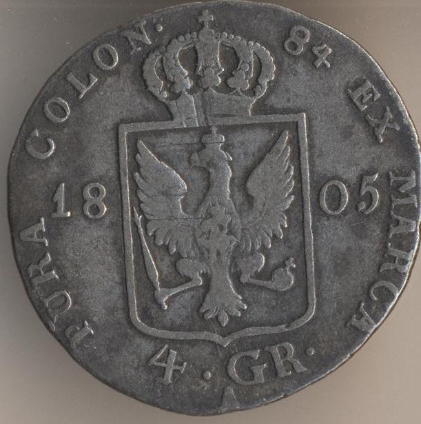 4 groschen 1805, silver. 521, weight - 5,345 g. Berlin Mint. Ruler: Friedrich Wilhelm III (1797-1840).