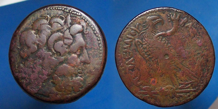 JBeen keeping myself busy so sorry I havent been posting much. I just traded for this today. Its one I've wanted for a while PTOLEMY II (not sure if its is II)285-246 B.C. AE42 about 46.5 g. Its was pretty hard to get a good photo of and didn't come out to well. Also grabbed a sestertius of Faustina and a small provincial of Faustina II