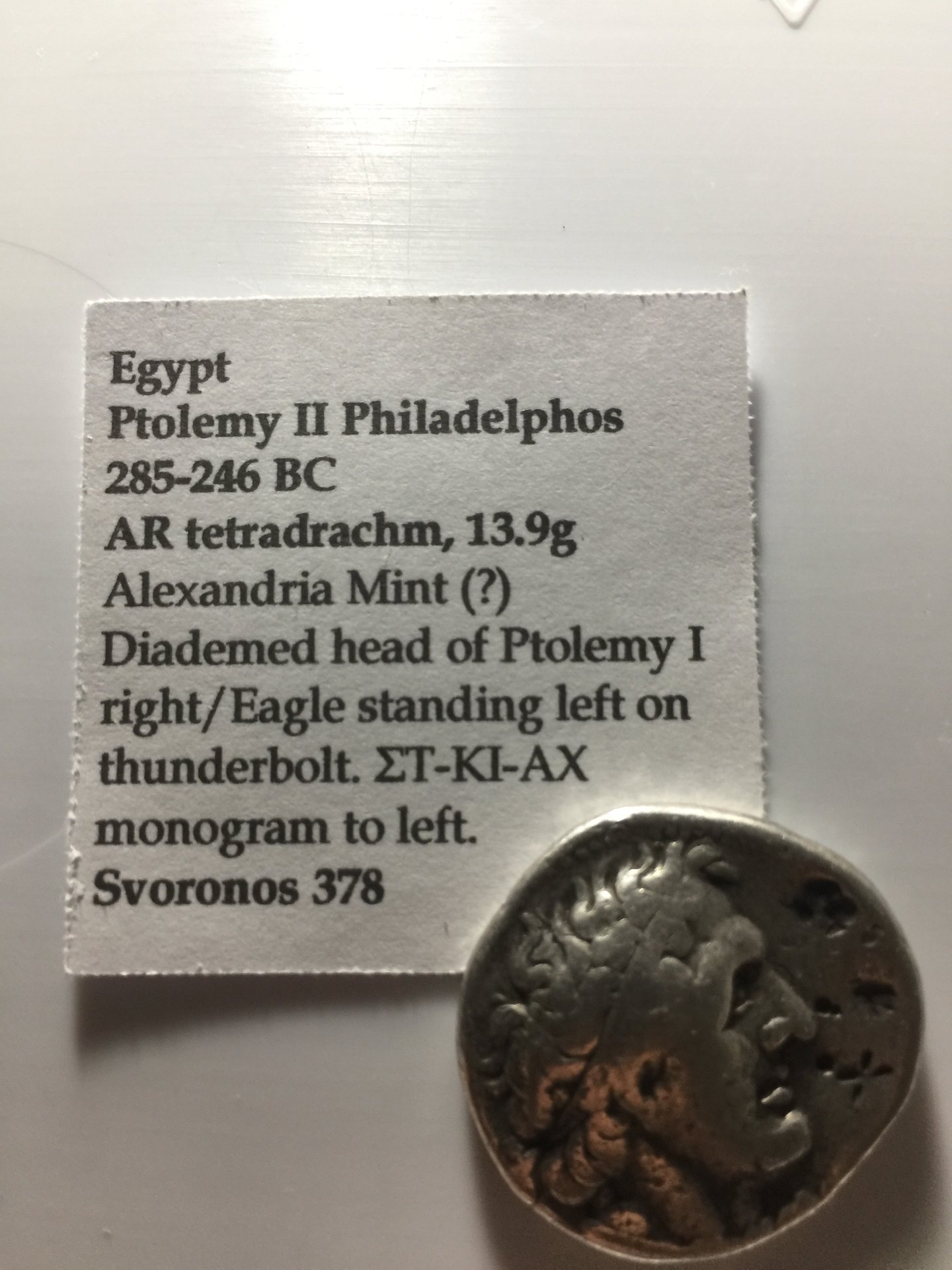 I'd pass and save your money for a better example, here's why: Comparing it with this which sold in May at CNG for $180, full legend, not so worn and better detail on the bust (not to mention that eagle is absolutely stunning!). PTOLEMAIC KINGS of EGYPT. Ptolemy II Philadelphos. 285-246 BC. AR Tetradrachm (26mm, 14.23 g, 1h). Alexandreia mint. Struck circa 285-261/0 BC. Diademed head of Ptolemy I right, wearing aegis around neck / Eagle standing left on thunderbolt; monogram to left. Svoronos 548; SNG Copenhagen –; Noeske 48. VF, toned, graffito under tone in field on reverse. 421, Lot: 402. Estimate $200. Sold for $180. This amount does not include the buyer’s fee.