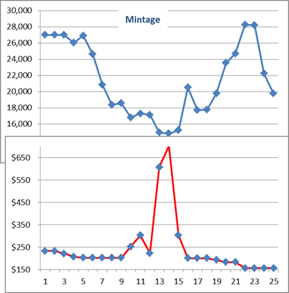 Here is a chart that I created to compare the market value against the mintage (where 1 is Hot Springs and 25 is Everglades. Mintage versus Market Value