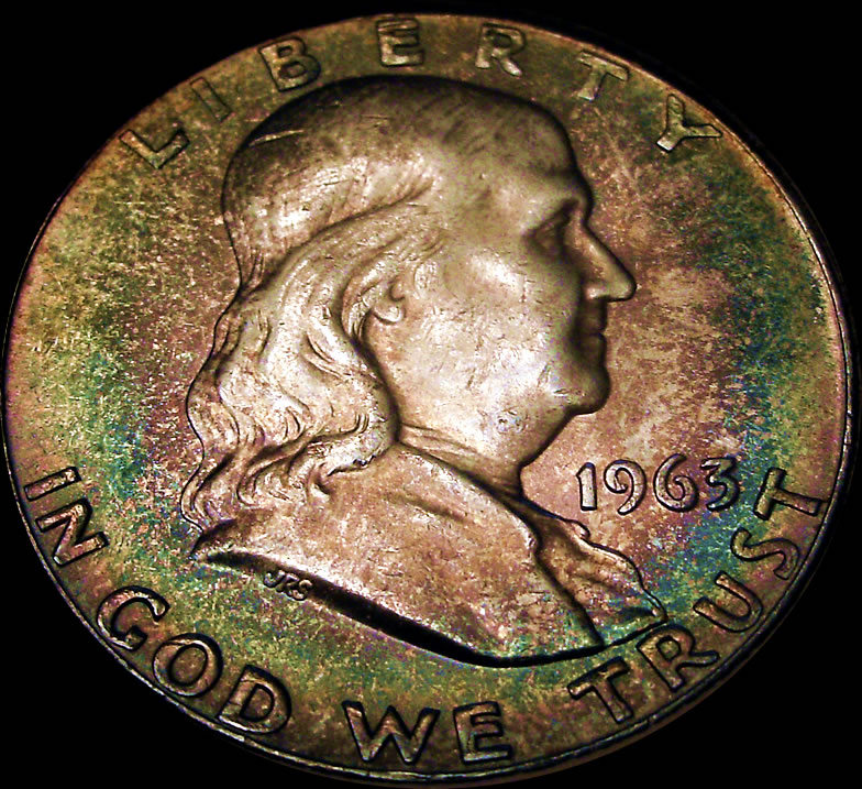 I'm not sure when I put those coins in, but it was some time in the late '90s. I had them in there untouched (probably about 10 years) until a couple of years ago when I decided to upgrade a couple of the coins, and found the fantastic toning patterns on the silver dollars. There was also a somewhat iridescent tone on the reverse of the Washington 90%, and the proof Jefferson nickel appears to have a blue tone. The Roosevelt silver dime is toned evenly on both sides because I had stored it in a manila coin envelope before transferring it to the 20th century set. The Lincoln wheat proof has psychadelic colors on the obverse, but the reverse looks like crap.