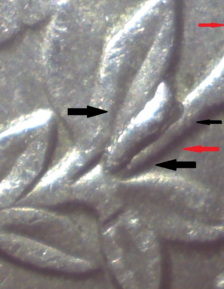 It looks like a die break to me. Keep in mind that the leaves and the stem are recessed on the die. It's not unusual for the edge to break away just as you might see erosion wear away a riverbank.