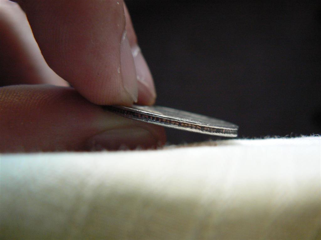 When you flip it on it's side it looks like a sandwich. There are the outer layers (silver part) and the inner layer (copper with the rib things on a normal coin). If I run my fingernail across it, it dips down slightly when crossing the inner layer.