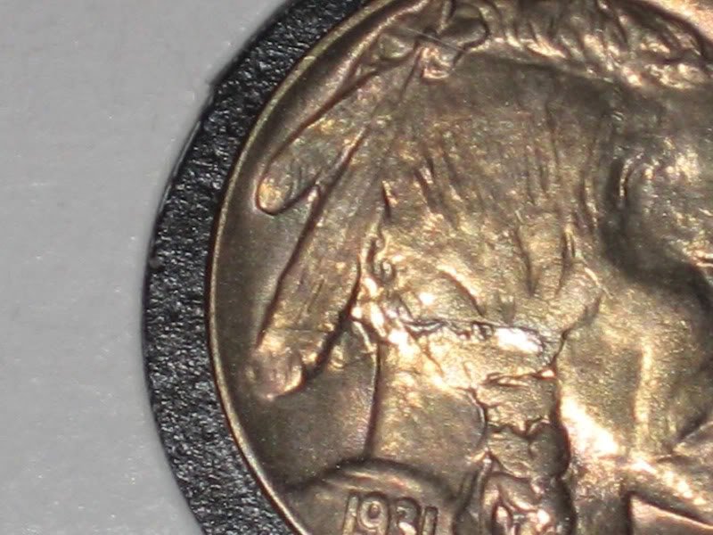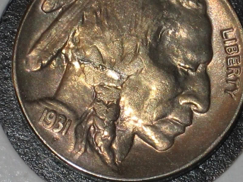 Here's a rare buffalo error on a 1931-S. It's very hard to photograph but in hand it's a beauty of a crack. This is a faulty planchet error.