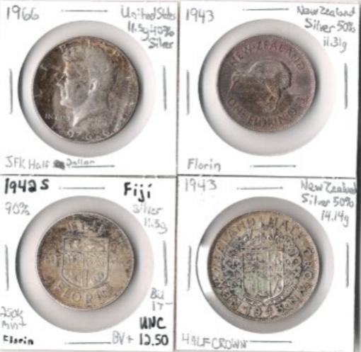 Personally, I would throw all four into a bulk silver lot of several pounds. The pictures aren't great, but I don't believe either of the NZ coins are uncirculated. After eBay fees, you are looking at bullion value or less in a typical auction scenario. When you have a lot of these coins, but not a lot of time to do everything needed to sell them individually, it's best to just sell them in lots.