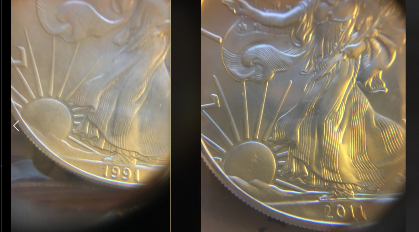 I just received some ASEs from APMEX and was lucky to get a 1991 and a 1992 in a random selection of 6 coins. My question is, the 1991 looks a bit different in the stamping when comparing to a later date, like a 2011 or 2013. The difference I mainly see is in the rays and the edge of the coin. The 1991 looks like it has a radius on the edge and also a thinner edge. Are these things common on a coin that was made a decade earlier? Thanks.