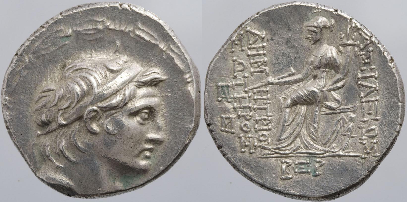 The practice of dating their coins in Egypt pre-dates the Romans. Coins of the Ptolemaic Kingdom also carry the regnal year. Ptolemaic Kingdom, Cleopatra III and Ptolemy X Soter, 110 - 109 B.C. and 107 - 101 B.C., Tetradrachm Obv:– Diademed head of Ptolemy I right wearing aegis Rev:- PTOLEMAIOY BASILEOS, eagle standing left on thunderbolt, wings closed, L I (year 10 of Cleopatra's reign) left, PA right; Minted in Paphos, B.C. 110 Reference:– Svoronos 1668, SNG Cop -, Noeske - Some coins of the Seleukid Kingdom also carry dating but this time relative to the founding of the Seleukids. Seleucid Kingdom, Demetrios I Soter, tetradrachm, 162-150 B.C. Obv:– Diademed head of Demetrios I right inside a fillet border Rev:– BASILEWS DEMHTROS SOTEPOS / BXR, Tyche seated left on throne ornamented with tritoness, holding short scepter and cornucopia; in outer left field, controls; in exergue Minted in Antioch on the Orontes, Seleukid Era 162 (151/0 B.C.) Reference:– Seleucid Coins 1641.8h; SMA 131. Obverse struck a little off center. Regards, Martin