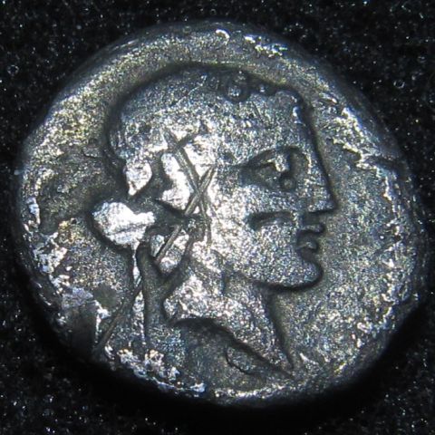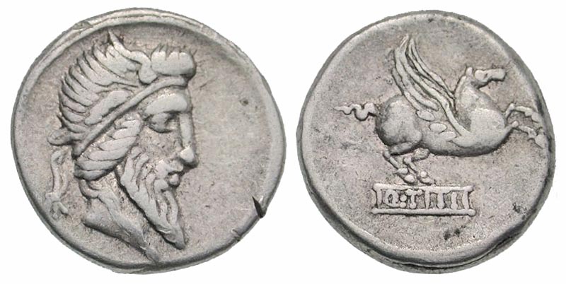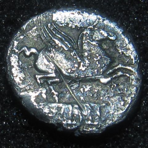 Another recent aquisition is this one. A lot of wear on this one, but these don't come up that often. Q. TITIUS 90 B.C. Moneyer Obv: Head of young Bacchus right, wearing ivy wreath and forehead band, no jewels in hair. Rev: Q TITI on a tablet, from which Pegasus springs right, Silver Denarius 17mm. 3.18gm. Ref: Crawford 341/2; Syd 692
