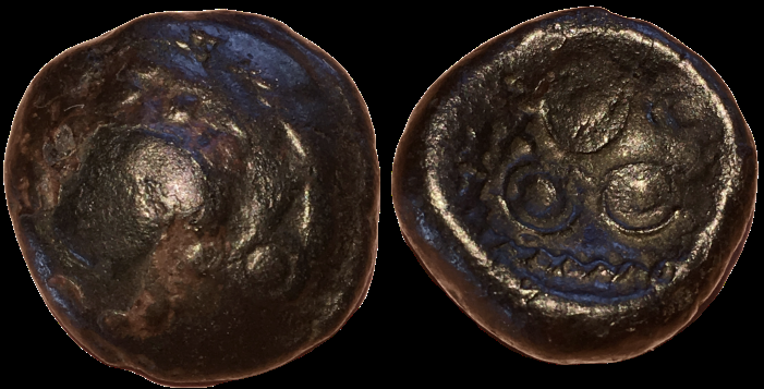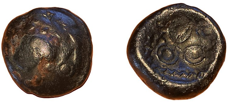 This is my rainbow cup, apparently found near Empel (Den Bosch), a Celtic sanctuary in what's now the Netherlands. Batavi. Potin ‘regenboogschoteltje’ or Rainbow Cup, c. 50 BC-0. Obv. convex: triquetrum. Rev. concave: 4 Celtic circles with small circles inside. 15 mm, 4.46 gr.