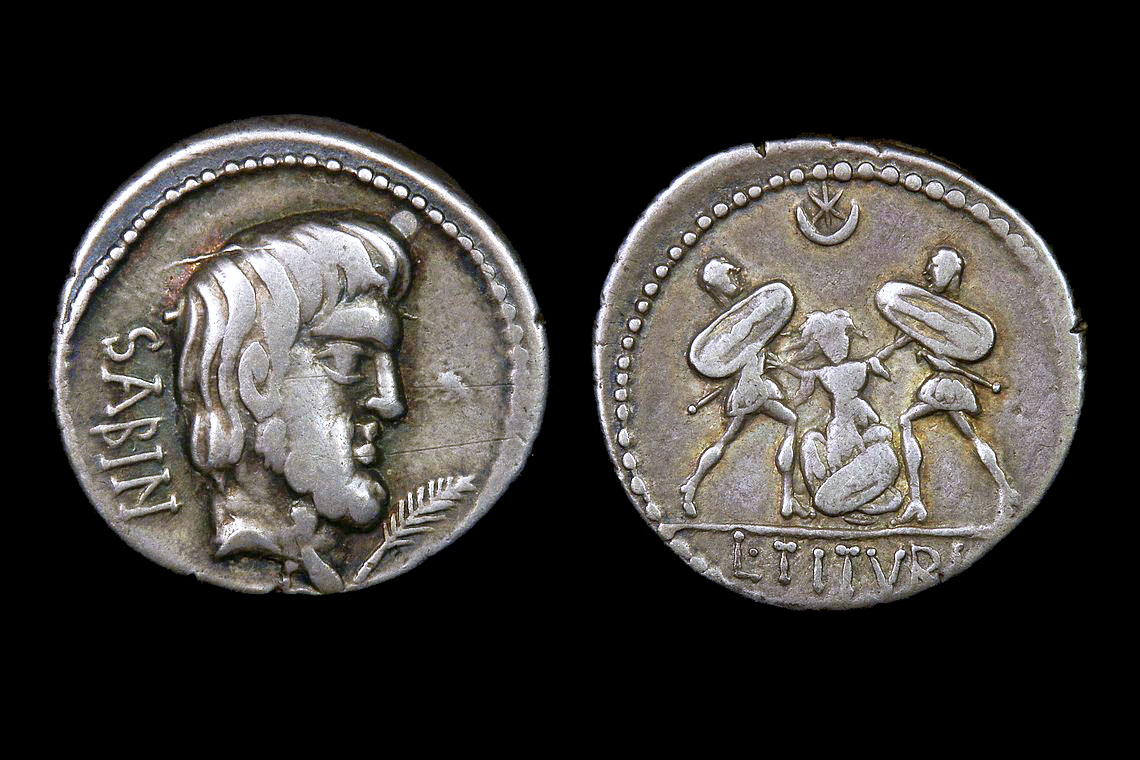 Cool piece. I had to have one when I first saw it. Cost was a trade but worth it to me. L. Titurius L.f. Sabinus. (89 B.C.) AR Denarius O: Bare head of King Tatius right, SABIN downward behind, TA in monogram before; R: Two Roman soldiers running left, each bearing a Sabine woman in his arms, L·TITVRI in ex. Rome 19mm 3.87g Crawford 344/1a,RSC I Tituria 2, Sydenham 698a, SRCV I 249