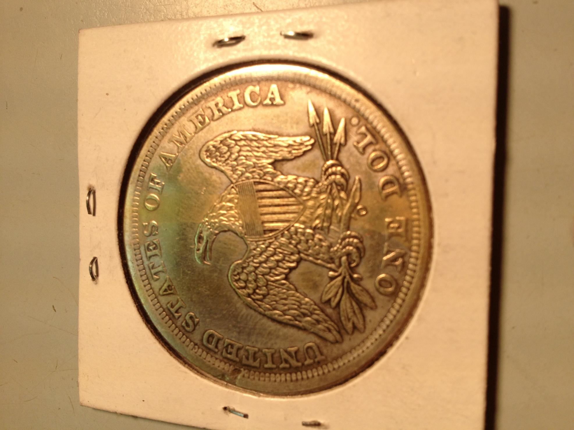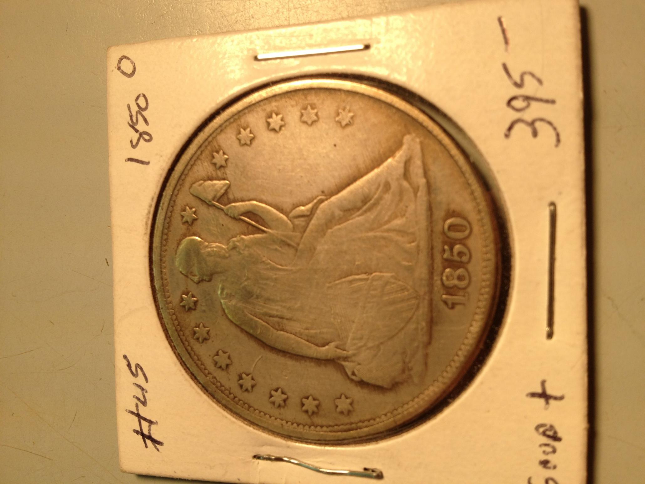 To bring this thread back to life, I went back to the Antique shop where they had these. The 1850-O was gone from the display but the Morgan was still there. Walked around the shop a bit to see if anyone else had new coins(many dealers in this building, but two people run the store). In the front register I seen some coins so I asked her to pull them out. I was shocked when I seen this in there for $25! I asked him about it and he said a guy brought them in and it weighs 1gram less than the dollar should weigh. He said it was silver and that's why he was selling it. I'm guessing its counterfeit from what i read here and its not real silver, but I figured I could use it as an example when I'm buying my older coins for my type set. Here it is, all $20 I paid for it.