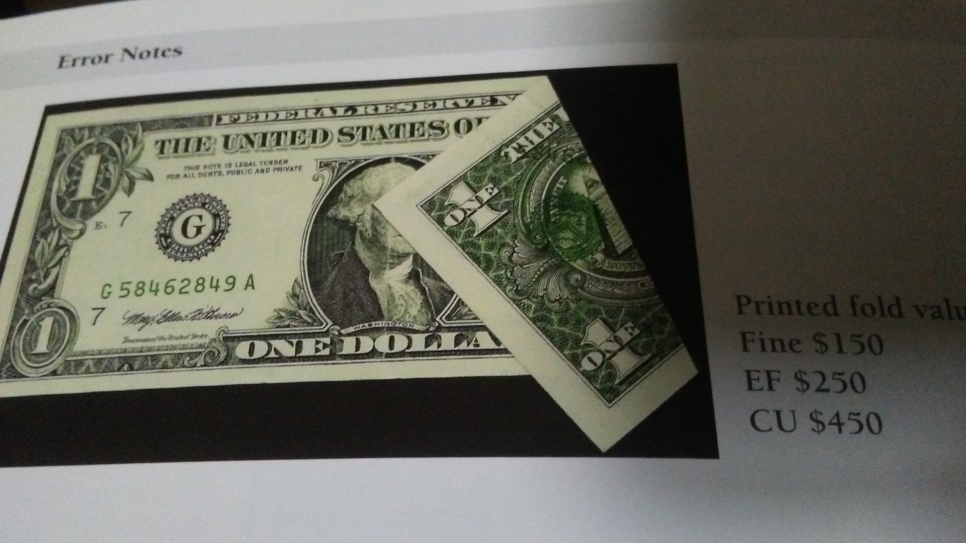 Does anybody know about U.S dollar Error bills ? I have got this very rare one dollar bill with the Fold Over error and the serial and most of the treasury seal on the back along with cutting error and extra paper, that seems totally genuine. My Only concern is about the ink smear of the District Seal , I'm wondering if it's indeed a genuine ink smear. I checked the paper with the counterfit detector pen and the bill's paper is totally genuine , but the bill when hold is a bit stiff and rigid and feels a bit different comparing other one dollar bills. When hold in the light some small yellow small spots are apparent on the bill but not much with the normal light ... I'm a bit concerned if the ink smear is genuine... the serial seems totally genuine , please advise the pics . I also held a brand new one dollar bill in one side and this bill on the left and you can see this error note a bit stands stiff , but all watermarks , security features and paper seems genuine. Please let me know your opinion. If the ink smear is valid this bill along with all its error is really unique.:happy: