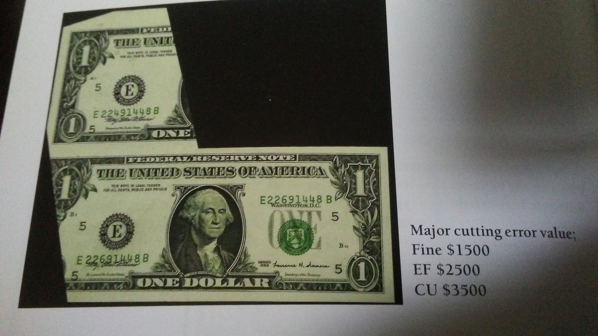mine has the small cut at the bottom , plus the extra paper , this Fold over ( I thought fold overs are more valuable ) though my bill has a unique one in which a part of the seal is on the front which is interesting , and the smear ... so if we total them up will it go above 2 K ? :D