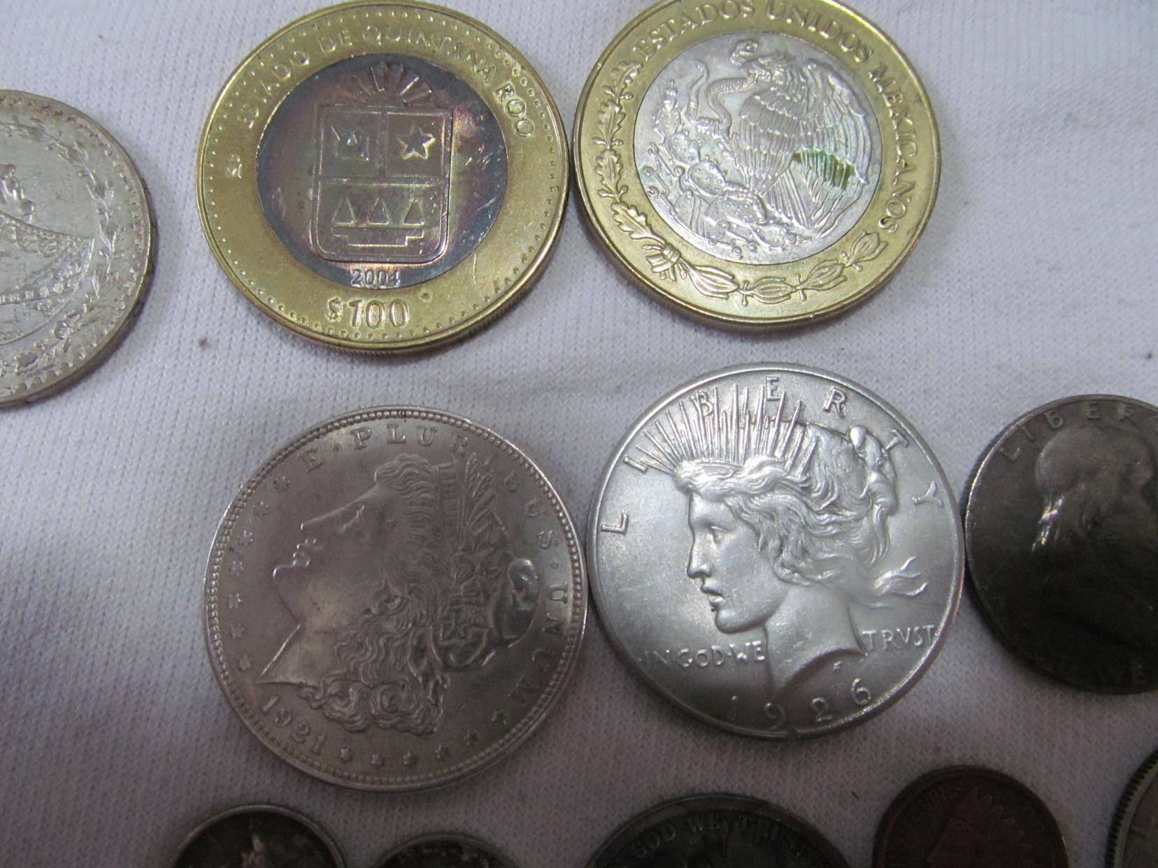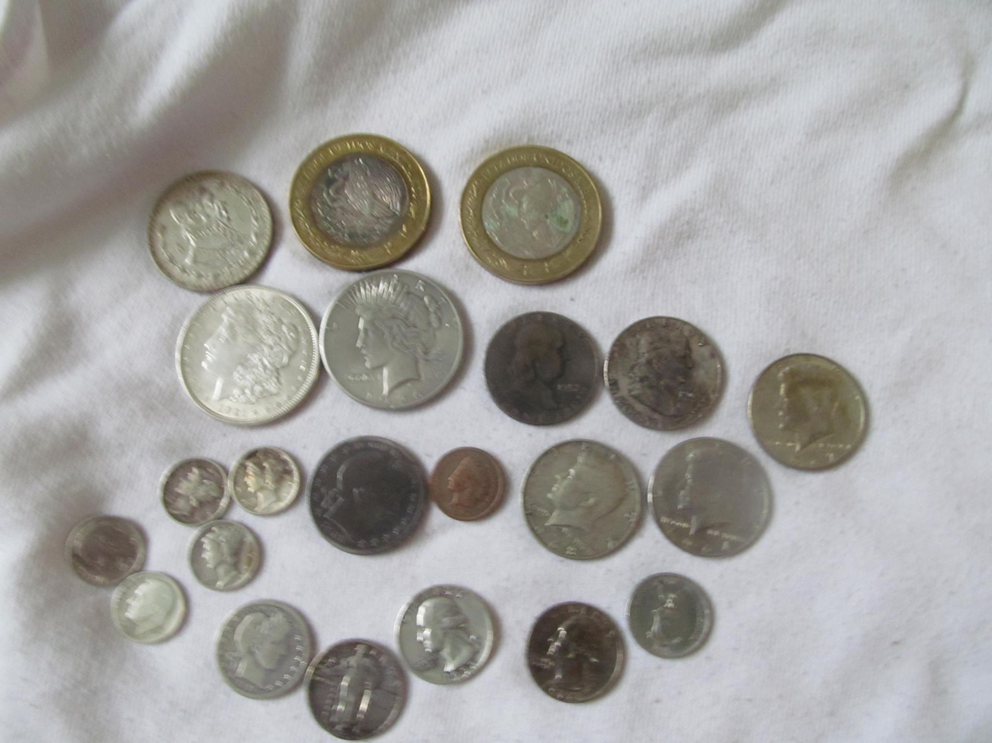 a guy posted everything except the peace and morgan dollars and the 2 100 peso silver bi metals for $20 and i jumped on it. i gave him $80 for all of it.also got a couple of nice nickles, a gold plated silver ike(why!?), and some other random mexican silvers with it.