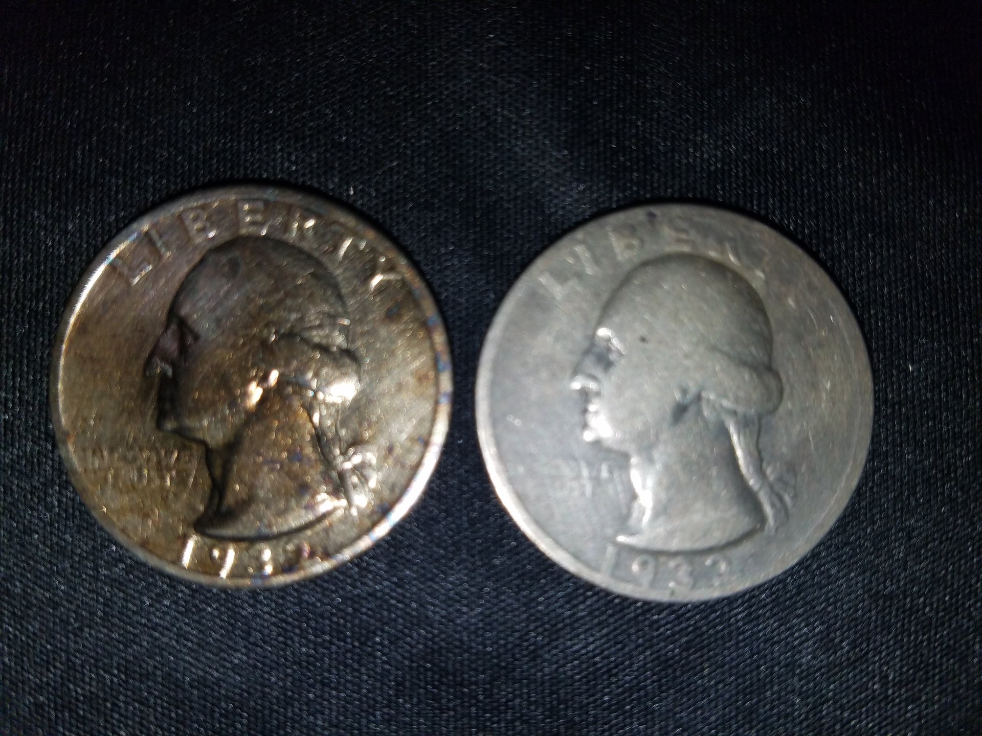 No concerns. One was in a wine cellar I guess. Never seen purple toning like it.I can take pictures of the mint. They don't have black around them and they seem to be the same mint mark. Both from different people.