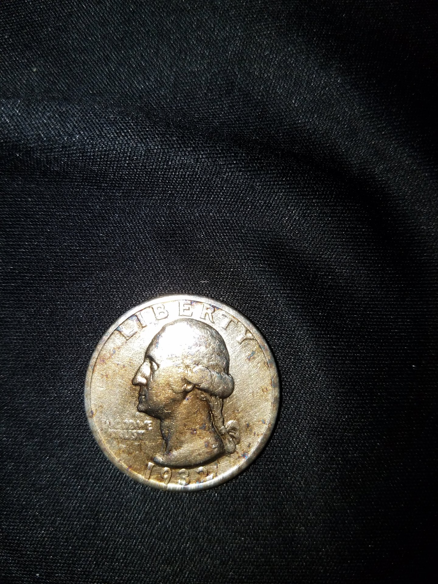 I dont think so on the fire damage. Trust me I had a barn burn down with tons of different metals I have other silver quarters that have that brown tone. Just never seen that dark of purple.