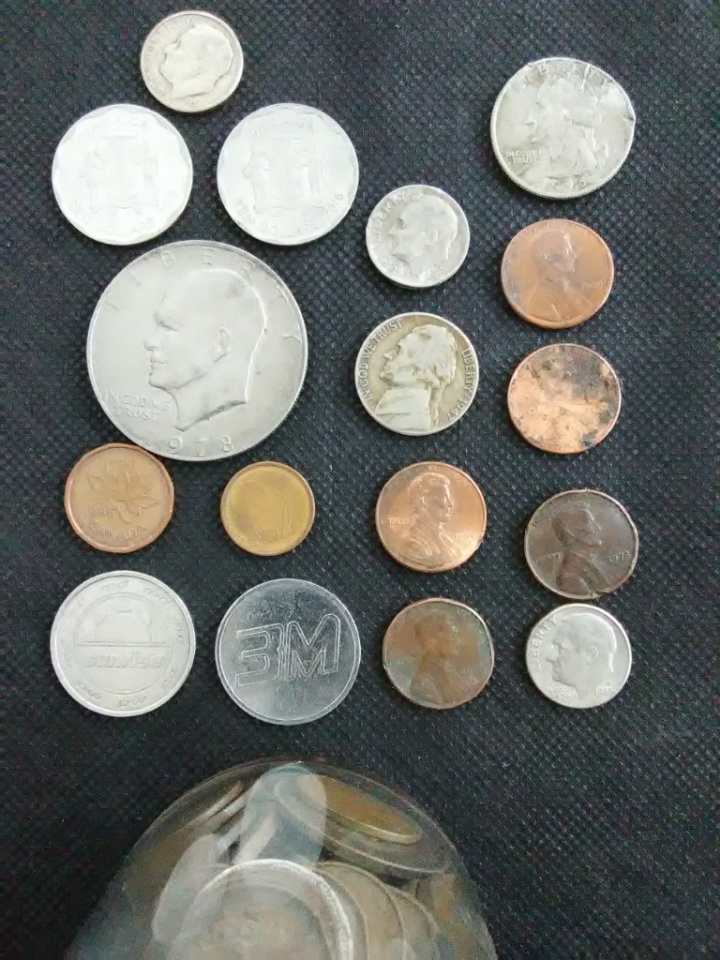 Canada: Quarter, 2 cents, dime, and silver dime Euro cents: 2-5, 2-2, 1-1 France 5 franks UAE 1 dirham 3 Australia 5 cents Japan 1 yen 6 Amusement tokens 1 flat cent (I love Seattle) 2 batteries 2032 and 1616 All in or on a coinstar.