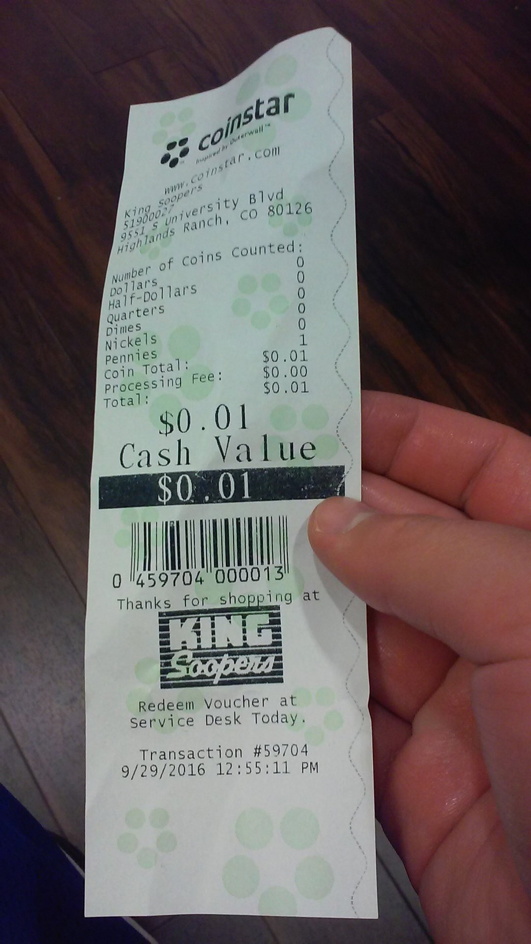 On the way out (just 10 minutes later): 1 modern quarter, 1 zinc penny