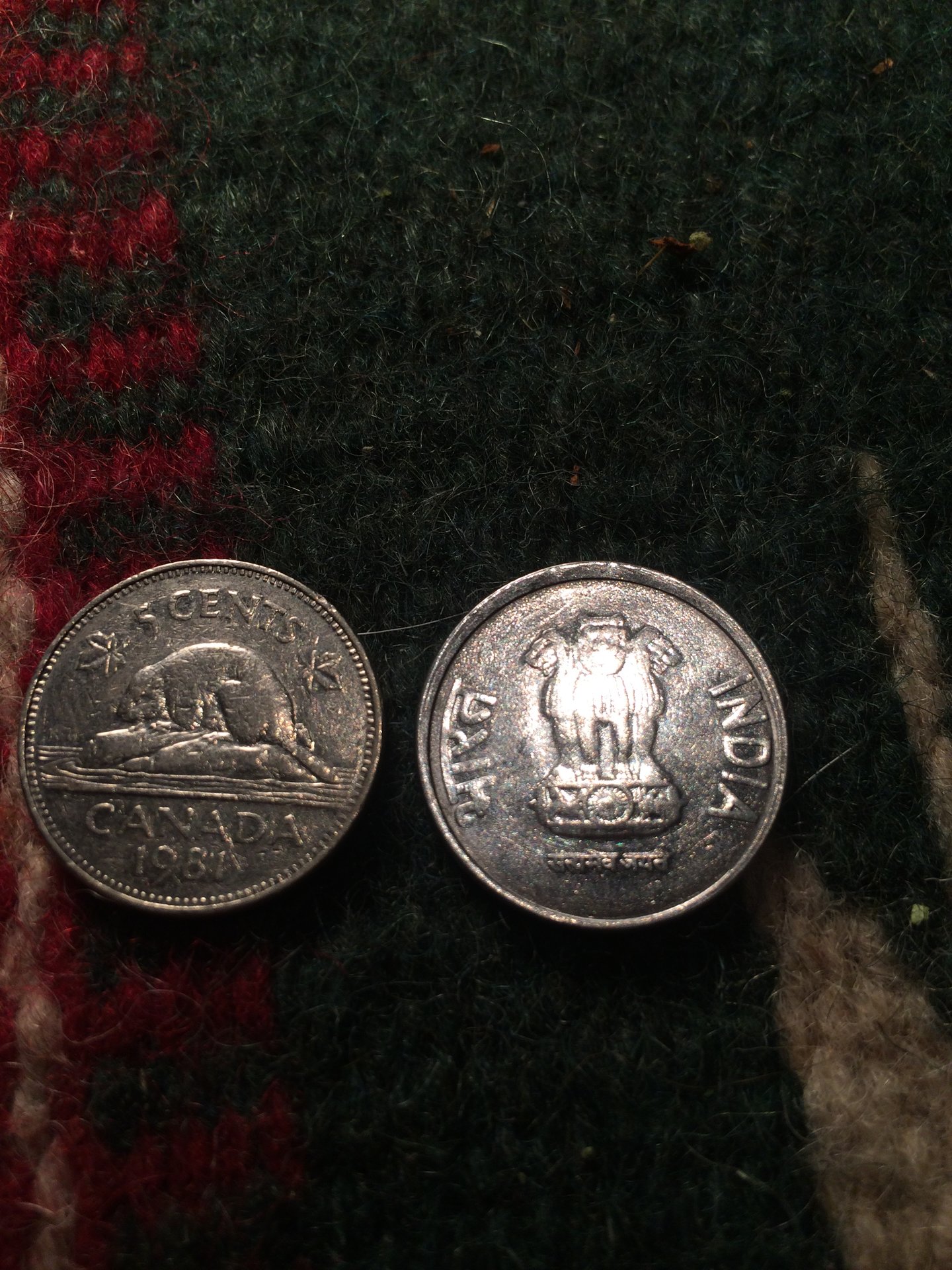 Slightly off centered India coin. With a Canadian and a new style Mexico. Mexico is too dirty. Keeping it for the metal content.
