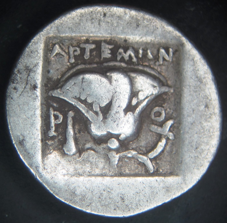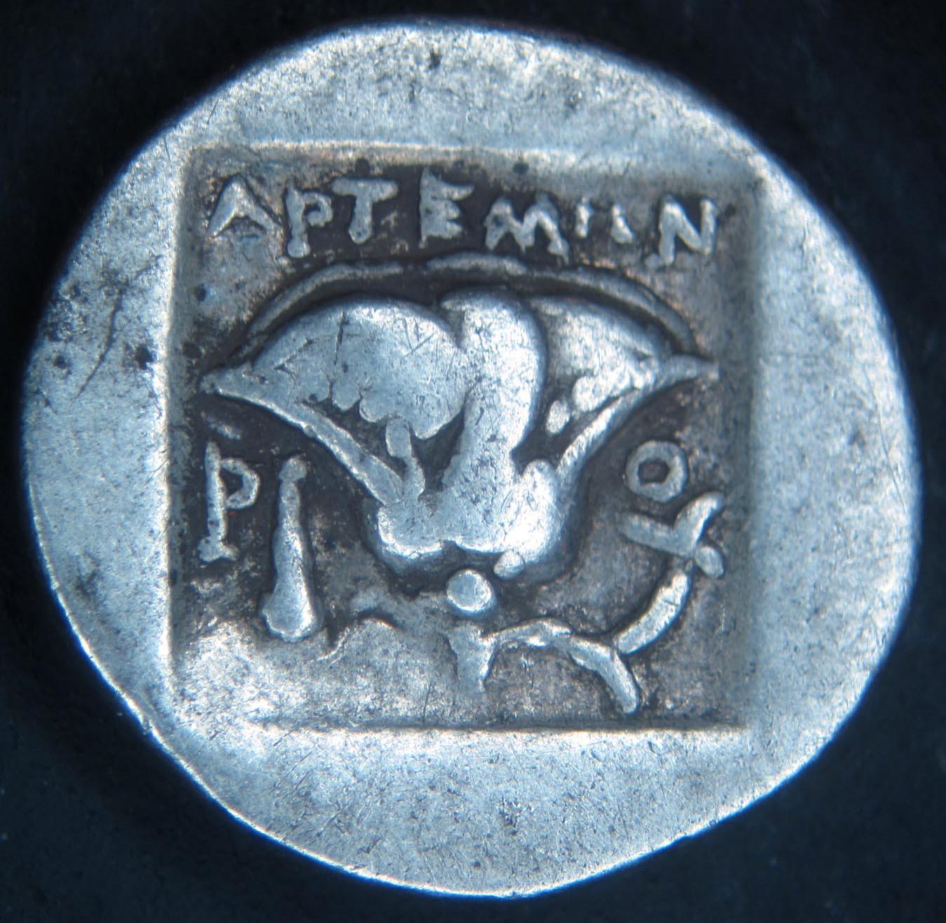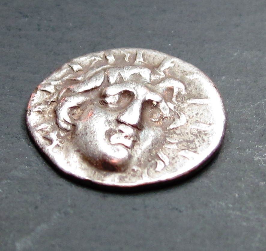 I just added another ancient coin to the collection. This Hemidrachm from Rhodes is 12-13 mm diameter and is made of silver. I’m told that it is from 167 to 88 BC. I don’t know if this dating can be narrowed down any further from the design or magistrate’s name on the reverse. There are several photographs of Helios coins on the Web but I didn’t find an exact match to my coin. Please take a good look & see if there is anything about this coin that looks fake to you. I bought it because (1) the Sun God facing forward, (2) it has a decent nose, (3) it has attractive surfaces, (4) it is very well centered. After really examining the centered strike & the beautiful 3D design I just had to buy it. I grade it VF. [The dealer repeatedly called it an EF but that does not make it an EF]. Do you think that VF is about right? Greece - Caria - Rhodes c. 167 - 88 BC AR Hemidrachm Obv: Radiate head of Helios facing slightly to right Rev: Rose w/ magistrate ΛΡΤΕΜΠΝ above and p & club below all in incuse square Perfectly centered VF coin