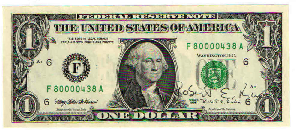 Uncirculated robert rubin dollar.1.jpg 1995 Signed One Dollar Bill by Robert Rubin (Secretary of Treasury).