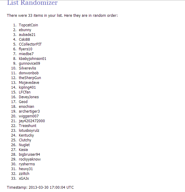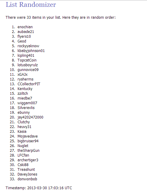 And we have a winner! But because I was feeling rather generous when I woke up this morning, I've decided to give away another one. Same concept for picking the second winner as the first, a random generated list. Winner No. 1 - TopcatCoin Winner No. 2 - enochian PM's have been sent to the winners. Thanks everyone for entering. Next contest will be in a few weeks or so.