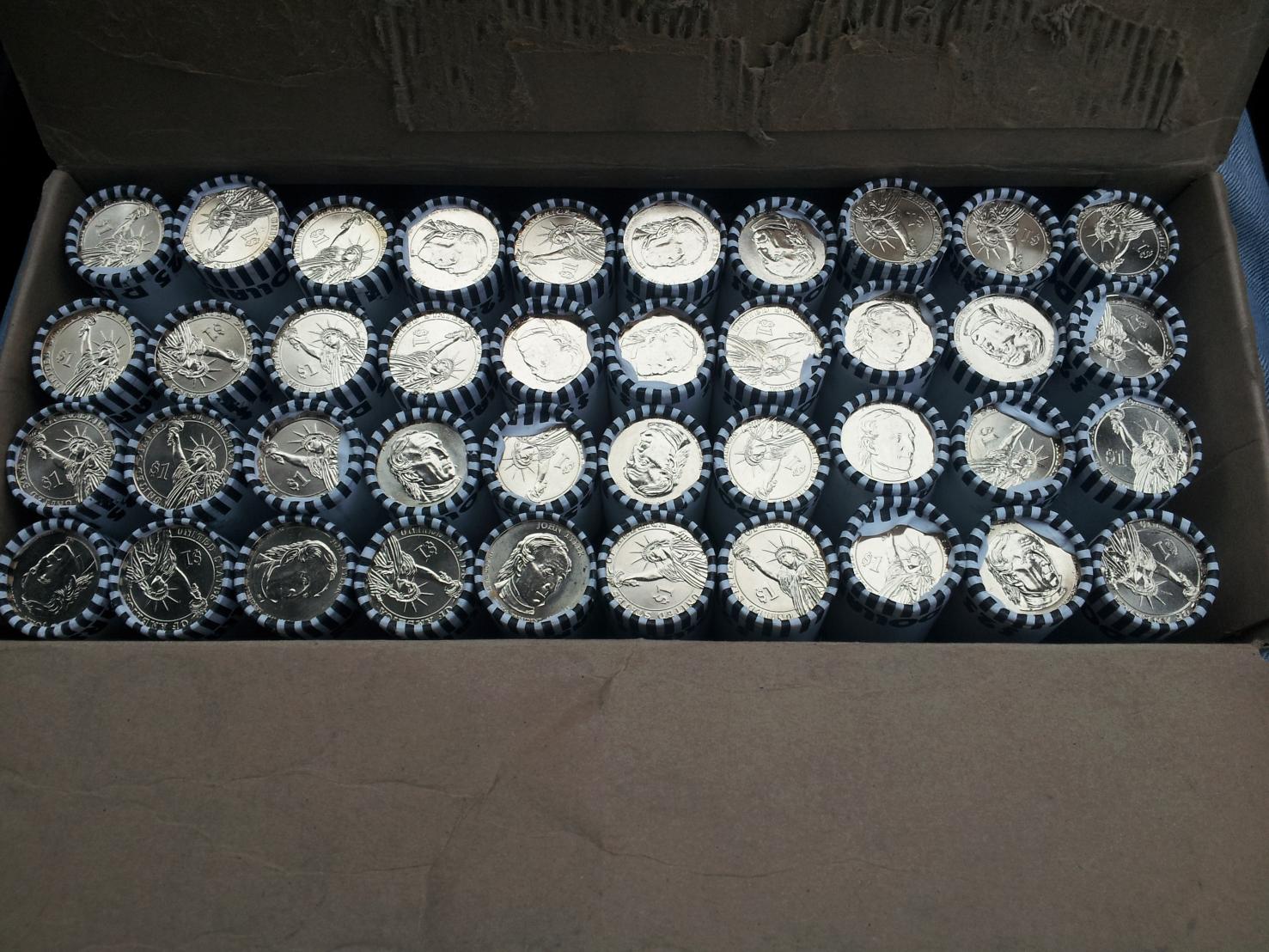 soooo bank called today and said my box of halves were in. this is the first box i've ever ordered. i drove up to bank and they brought the box out to counter. said that would be $500. I pulled out the cash and handed it to them and they said enjoy. i got back in truck and headed out of town. about 5 miles outside of town i cracked open the box with a knife and saw a gold looking reflection. i pulled over and looked and they were gold $1 coins. a whole box of (40 rolls) x $25 rolls.