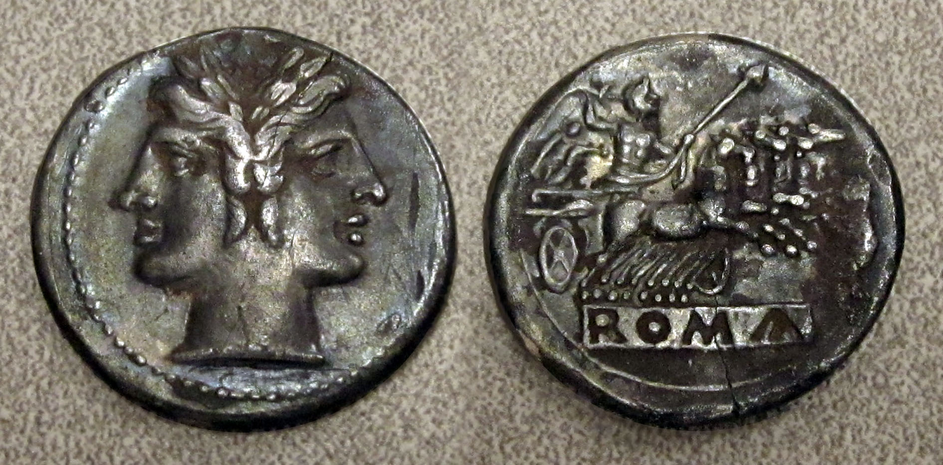 From the ancient Greek city state of Rome......... The coin: The coin label: Roman Republic AR Quadrigatus 225 – 215 B.C. 6.22 gms, 22 mm Obv: Janiform Head within beaded border Rev: Quadriga right driven by Nike carrying Jupiter throwing thunderbolt. Inverse relief ROMA on tablet in exergue Grade: good VF+ with minor flaws / rough planchet at 3:00 on the reverse. Overall very attractive including dark cabinet toning, good centering and strike. Other: From the ancient Greek city state of Rome (before Rome kicked everyone in the butt). Sear book #80, RSC-23, Craw 29/3 The YouTube video: Please post ’em if you got ‘em.