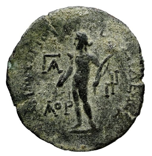 But are there any depictions of Marnas on coins, in the first place? In the Hellenistic period there were sometimes coins with a bearded and laureate head of Zeus. In the Roman period the coins of Gaza show Apollo and Artemis, Io, the Tyche, Herakles and Minos. Under Marcus Aurelius a new deity is introduced: young, unbearded nude male standing (never seated) holding a long vertical tortuous thing that can be a long lightning bolt or a mere branch, and pouring libation on altar. He looks like a genius more than like a Zeus (does Zeus make sacrifices?). Under Elagabalus only there is a nude unbearded Zeus standing, holding thunderbolt. None of these deities is explicitly labelled "Marnas". Some numismatists want to see Marnas on Hadrianic large bronzes showing Artemis and Apollo standing in distyle shrine, just because MAPNAC or MAPNA is written on the Apollo side, but it does not make sense : the legend is ΓAZA MAPNAC or ΓAZA MAPNA and means "Treasury of Marnas", probably because these coins were minted in the Marneion with bronze from the temple treasury.
