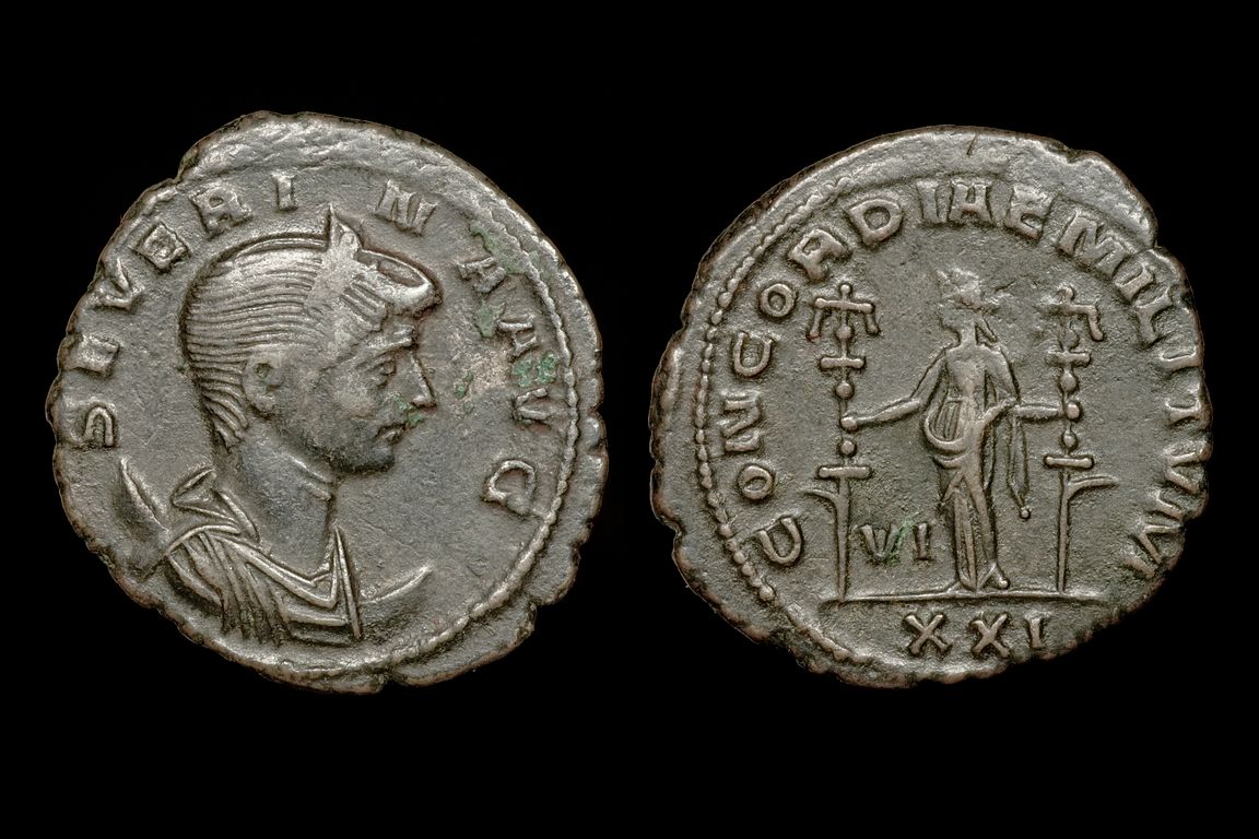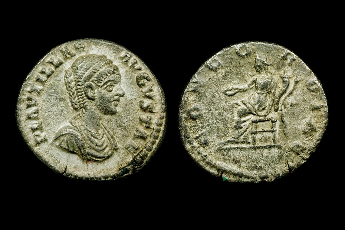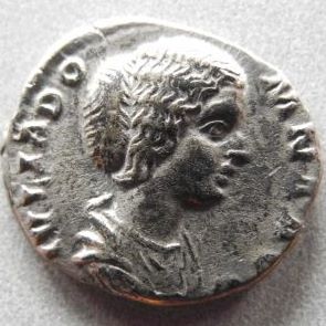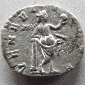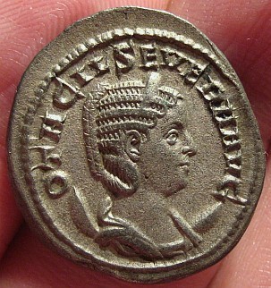 This is probably my favorite women of Rome coin: Julia Domna AR Denarius OBV: IVLIA DOMNA AVG, draped bust right REV: VENERI VICTR, Venus standing right, naked to waist, leaning on column to left, holding palm and apple Struck at Rome, 194 AD RIC 536
